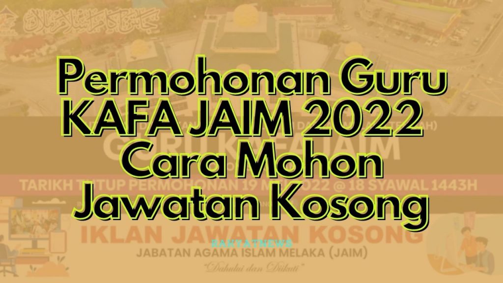 Permohonan Guru KAFA JAIM 2022. Jabatan Agama Islam Melaka (JAIM) telah membuka permohonan bagi mereka yang berminat untuk mengisi jawatan kosong sebagai Guru Kelas Al-Quran dan Fardhu Ain (KAFA) secara kontrak.